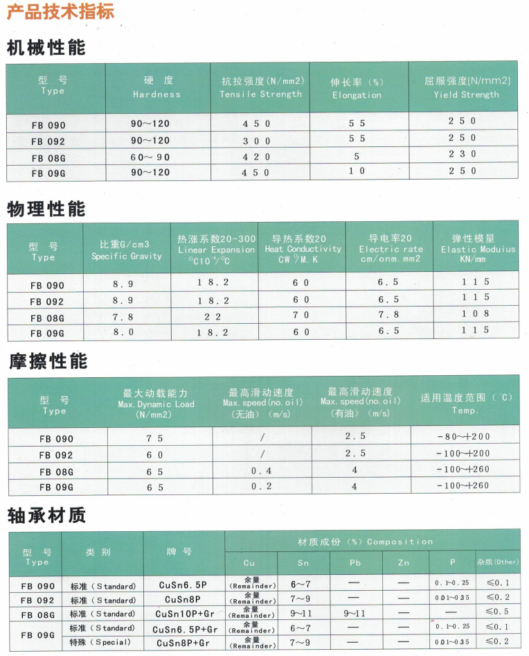 FB 08G固体润滑轴承,是以JF-8OO5R金属材料为基体,合金层埋入特殊固体润滑剂制作而成的新颖簿壁固体滑动轴承。由于高强度承载的合金材料作基体,理想的填充材料为耐磨剂,合理的菱形块状润滑设计,使润滑 面积达25%以上,因此,能发挥良好的润滑性和抗磨耗性能。产品已应用于汽车变速齿轮 箱、发电机、升降机、起重机及冶金机械等行业。