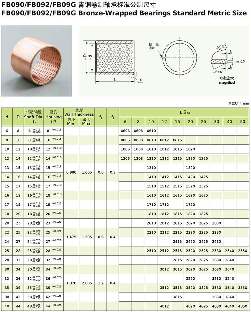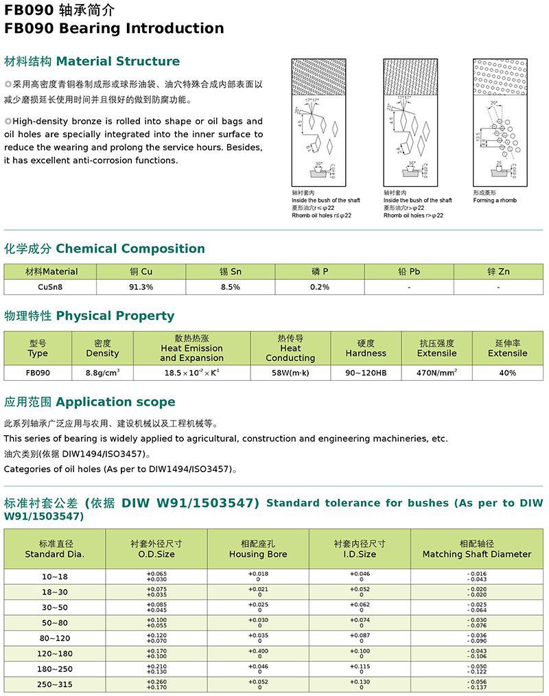 FB090系列轴套最大特点是薄壁结构,不占据很大的装配空间。轴套材料采用特殊配方高密度铜合金带材。它与传统的铺型铜套相比,具有密度高,无气缩孔、承载能力大,又有耐磨耐疲劳等优点。轴套制造采用先进的工装模具,可在带材摩擦面上加工出适用各种工程条件的油穴、油坑、油槽,从而使轴套在使用可储存大量润滑油脂,延长加油间隔时间,有效的提高了使用寿命。
